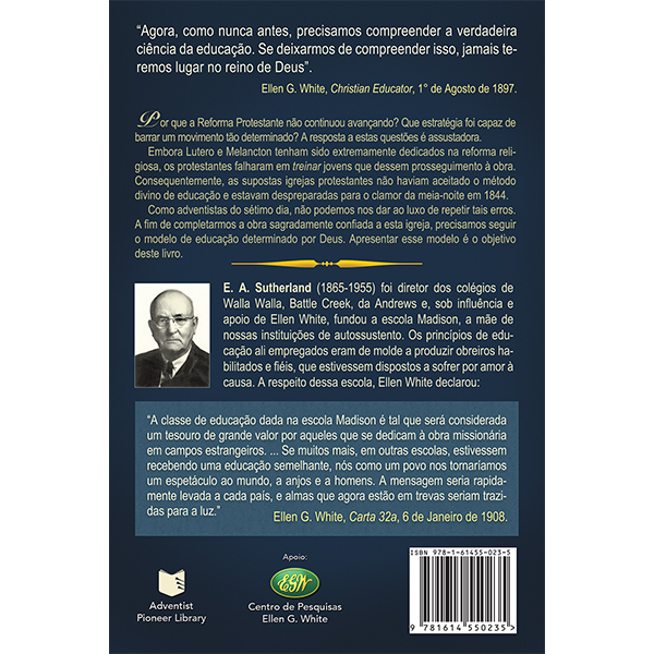 Por que a Reforma Protestante não continuou avançando? Que estratégia foi capaz de barrar um movimento tão determinado? A resposta a estas questões é assustadora. Embora Lutero e Melancton tenham sido extremamente dedicados na reforma religiosa, os protestantes falharam em treinar jovens que dessem prosseguimento à obra. Consequentemente, as supostas igrejas protestantes não haviam aceitado o método divino de educação e estavam despreparadas para o clamor da meia-noite em 1844. Como adventistas do sétimo dia, não podemos nos dar ao luxo de repetir tais erros. A fim de completarmos a obra sagradamente confiada a esta igreja, precisamos seguir o modelo de educação determinado por Deus. Apresentar esse modelo é o objetivo deste livro, escrito por E. A. Sutherland, o fundador do Colégio Madison.